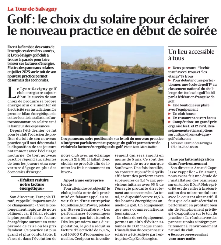 Nous remercions chaleureusement le Lyon-Salvagny Golf Club pour sa confiance, ainsi que Le Progrès pour cette mise en avant. Ce type de parution rappelle que la transition énergétique se construit aussi à l’échelle locale, à travers des projets concrets, visibles et directement utiles aux utilisateurs.